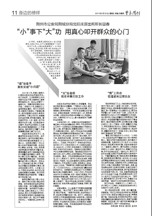 21年前,田春穿上警服成为一名人民警察时,他雄心万丈,立下从警铮铮誓言“一切行动为了人民,心里永远装着群众”。21年后的今天,岁月不居,沧桑入面,他的脸上平添了坚毅果敢,言语行动处处透露出对公安事业的坚定与执着。担任朔州市公安局朔城分局北旺庄派出所所长以来,田春坚持从“细”处着手,聚焦突破“小问题”;从“实”处着眼,精准开展打防工作;在“情”上用功,锻造爱民过硬队伍,用真心叩开了群众的心门,以实际成效谱写辖区治理新篇章。