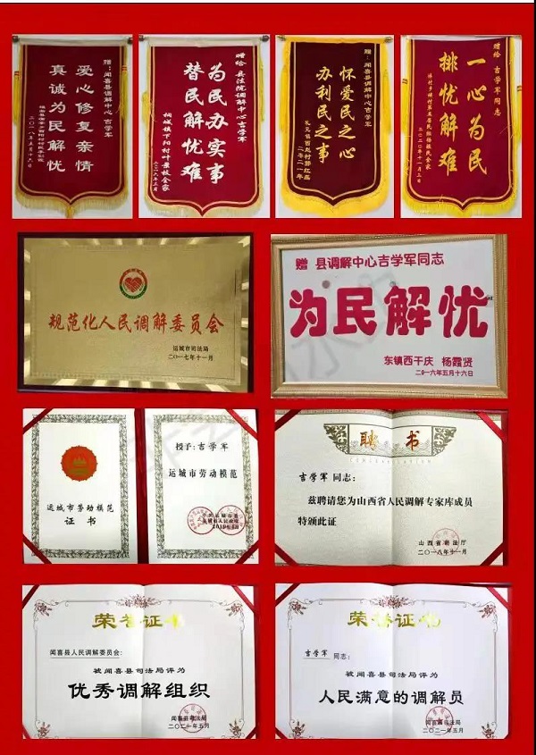 自闻喜县矛盾纠纷调解中心成立以来,共接待来访群众5700余人,受理案件1045余件,调解成功1025余件。如今的闻喜县,乡村群体性事件、民转刑案件明显减少,这是闻喜县人民调解工作的一份成绩单,成绩单背后也融入了吉学军的心血。8年来,他把热心、热情、热血都献给调解工作,鞠躬尽瘁做到了人民调解员为人民,成为河东大地上一张响亮的调解名片。