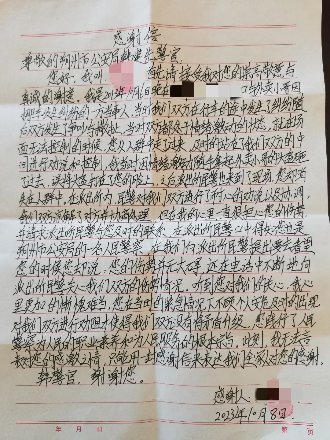 “您在当时的紧急情况下不顾个人安危及时的出现,才使得我们双方没有将矛盾升级...