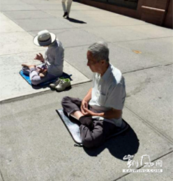 ▲2015年7月20日,叶浩夫妇纽约街头打坐,蒋雪梅背后的罗锅十分明显