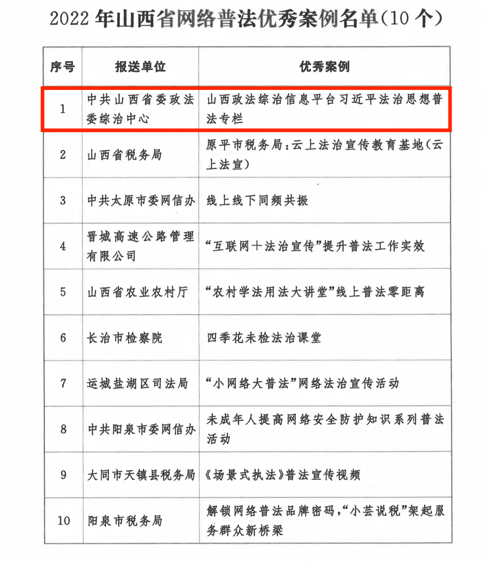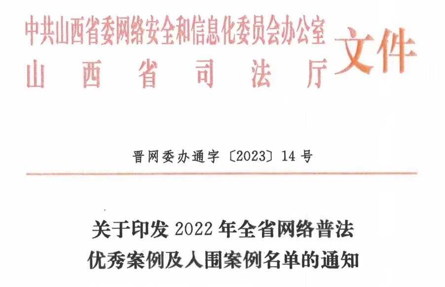 近日,由省委网信办联合省司法厅主办的“山西省网络普法优秀案例征集推选活动”公布评审结果,由山西省委政法委综治中心选送的“山西政法综治信息平台习近平法治思想普法专栏”荣获“2022年山西省网络普法优秀案例”。