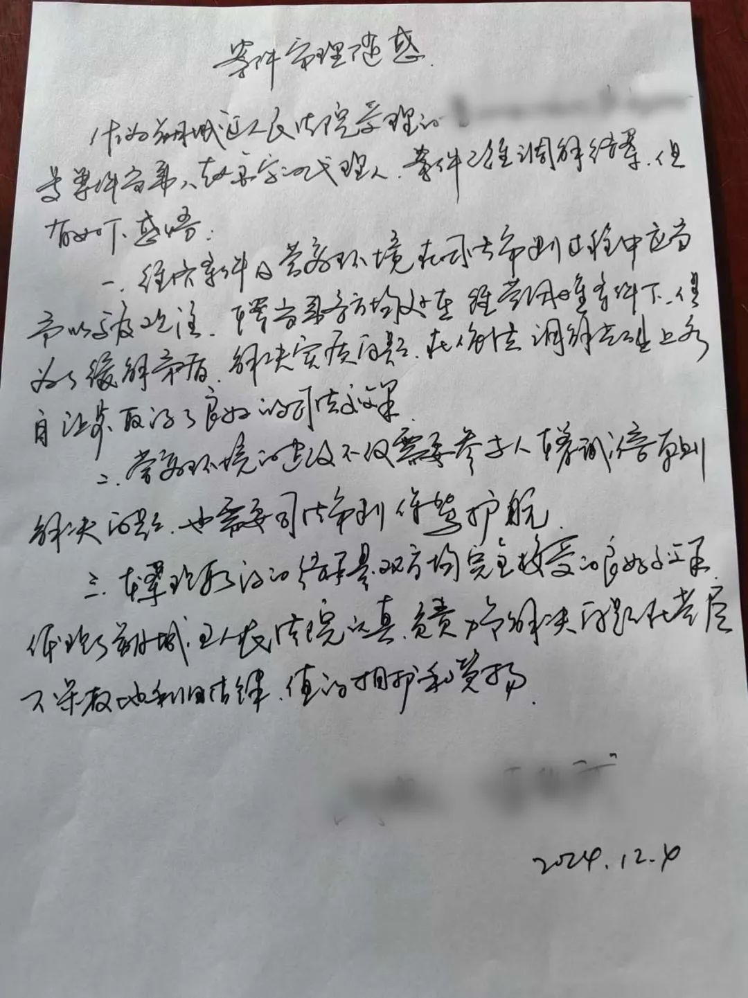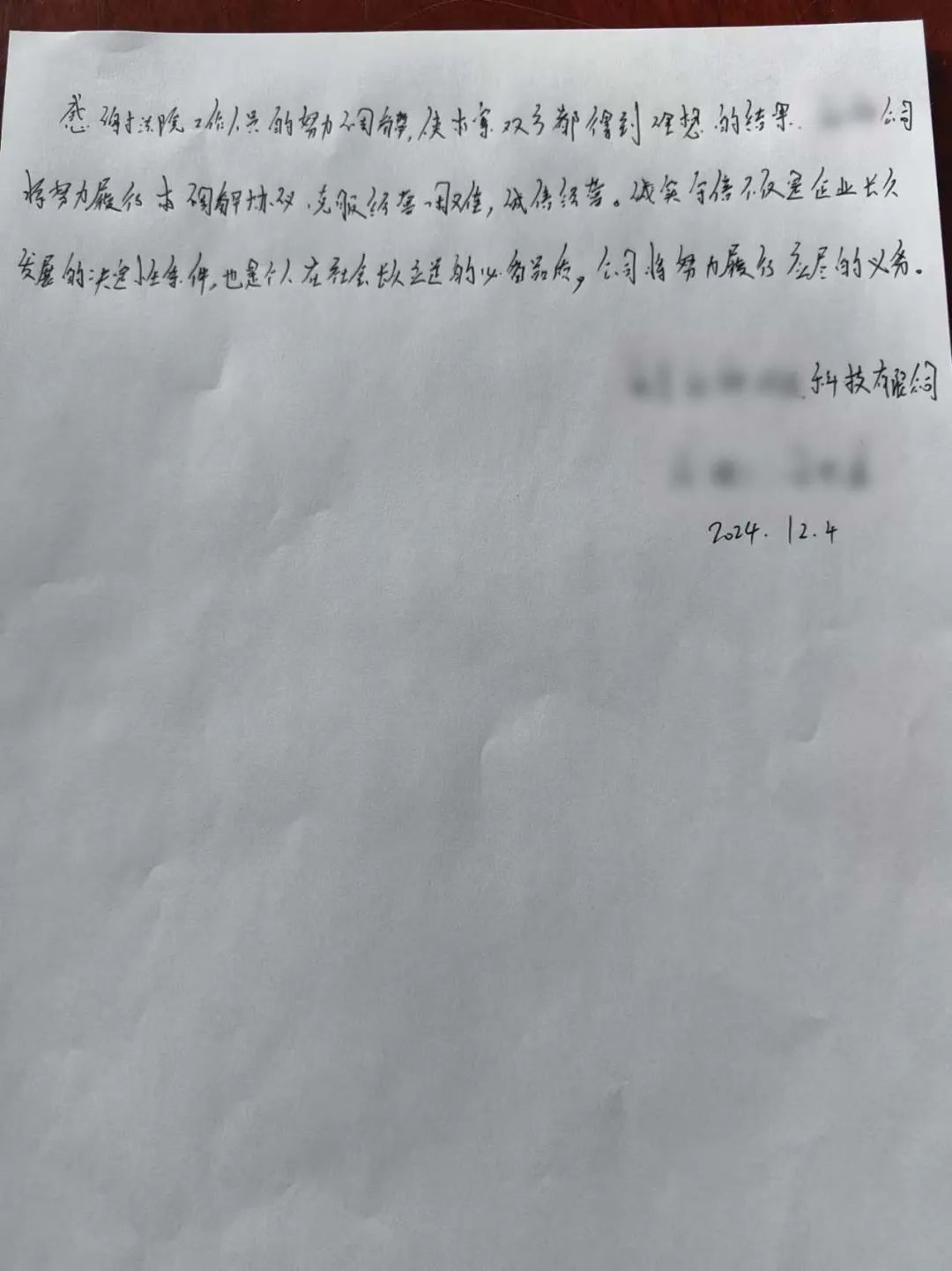 调解后,双方当事人现场提笔写下案件调解感悟。赵某某表示,本案当事各方均处在经营困难条件下,但为了缓解矛盾,解决实质性问题,在依法调解基础上各自让步,双方完全接受,体现了朔城区人民法院认真、负责解决问题的态度,值得赞扬;营商环境的改善优化不仅需要参与人本着诚信原则解决问题,也需要司法保驾护航。北京某公司表示,感谢法院工作人员的努力调解,使本案双方都得到理想的结果,本公司将克服经营困难,诚信经营,努力履行应尽的义务,实现企业长久发展。