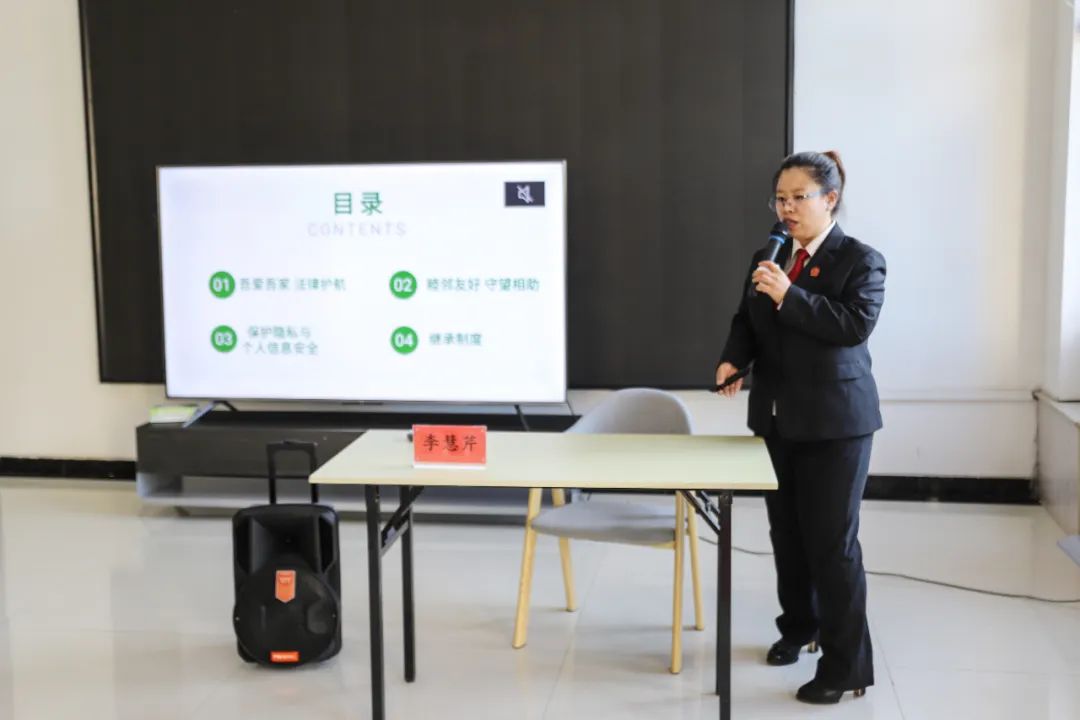 为了让本次专题讲座内容真正融入社区居民生活,宣讲团队查阅了大量资料,精心准备了宣传资料。课程主讲人李慧芹将7个贴近社区居民日常生活的典型案例引入课堂,围绕社区群众关心的民生问题从婚姻家庭、邻里关系、隐私与个人信息保护、继承制度四方面展开讲解。