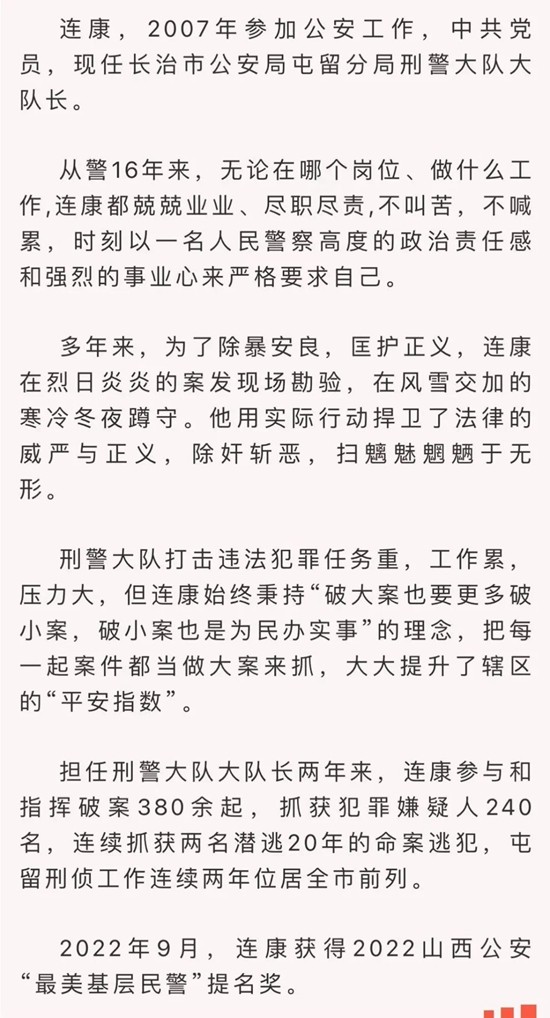 近日,长治公安机关举行“公安心向党 护航新征程”——长治公安英模学习宣传贯彻党的二十大精神“云”宣讲活动,用身边的英模事迹激励全体民辅警牢记初心使命,勇于担当作为。
